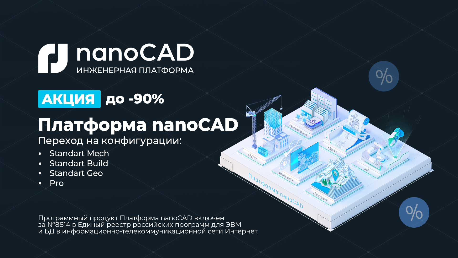 Скидка до 70% на перевод постоянных лицензий Платформы nanoCAD с модулями в конфигурации Standart Build/Mech/Geo