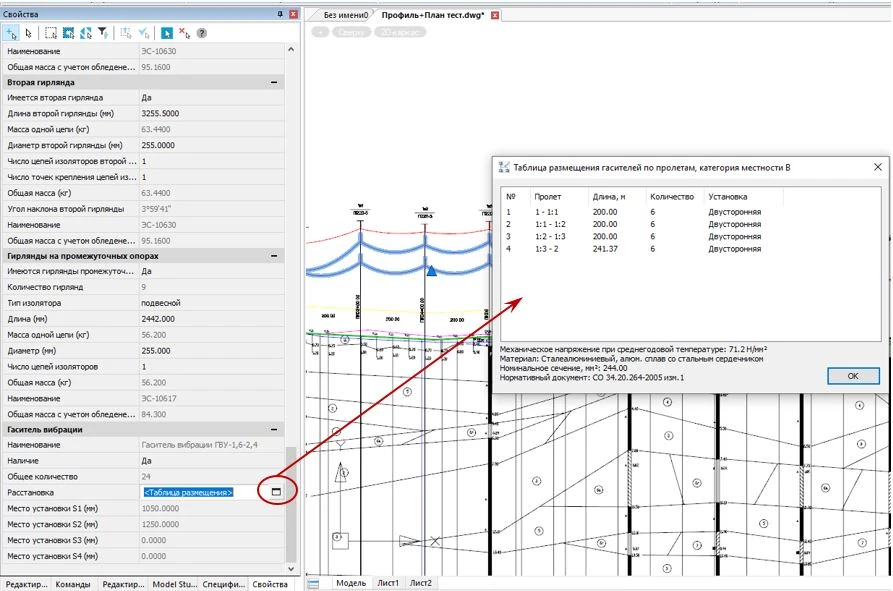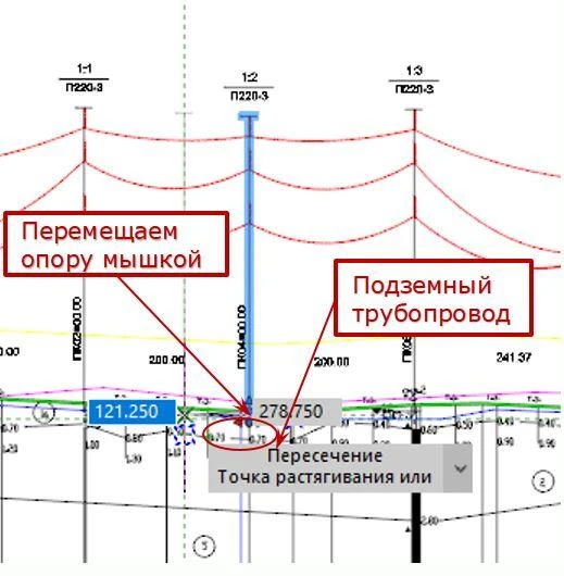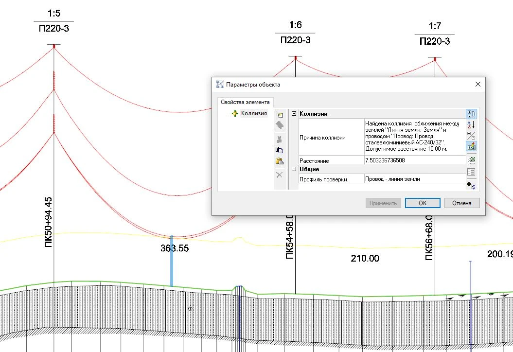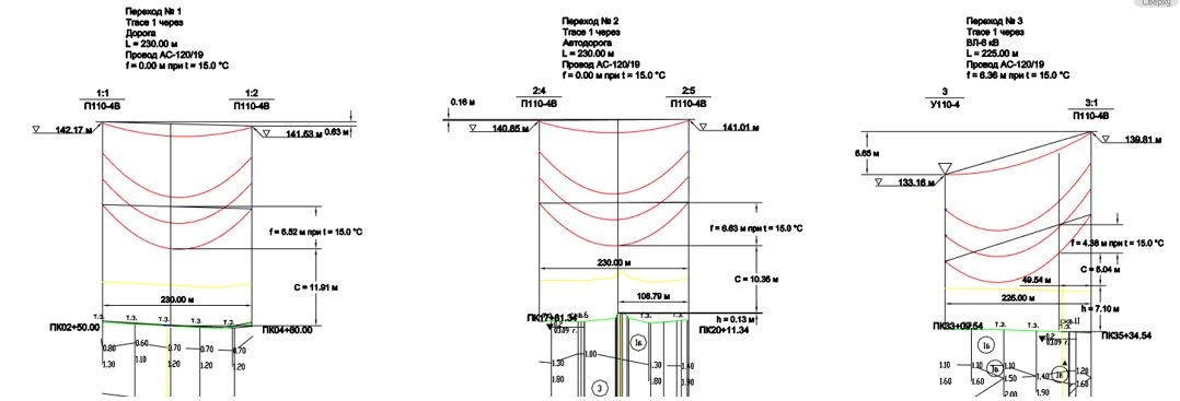 - Изменение положения анкерно-угловых и промежуточных опор на плане/профиле приводит к их смещению в 3D-модели и наоборот;