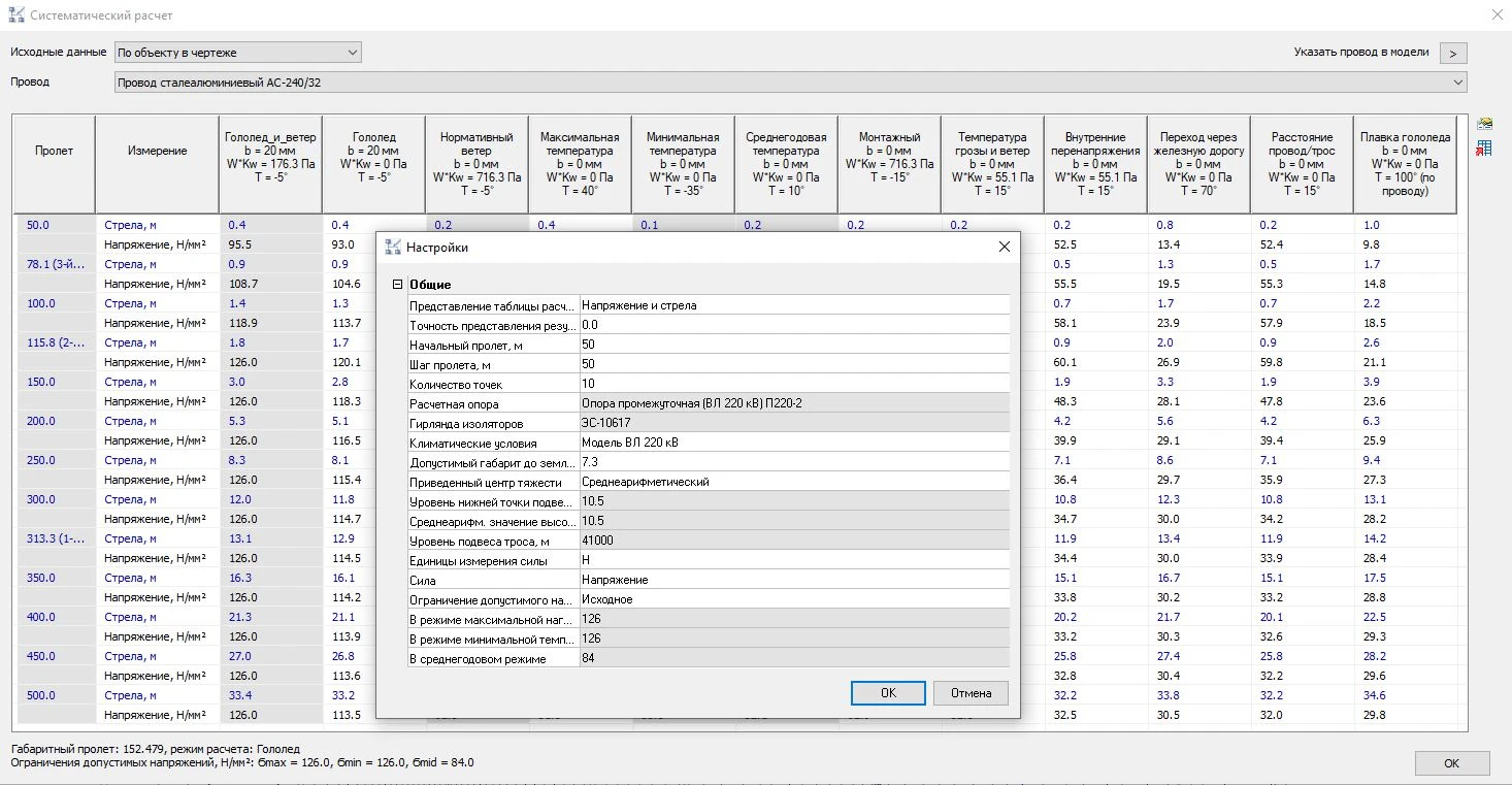 В программном комплексе Model Studio CS ЛЭП реализована возможность систематического расчета провода. Функционал для систематического расчета выполнен просто и удобно, позволяя мгновенно просчитывать любой выбранный провод с любым шагом пролета при любых климатических сочетаниях. Рассчитать можно провод/трос/ВОК из базы данных или указать провод в модели ВЛ.