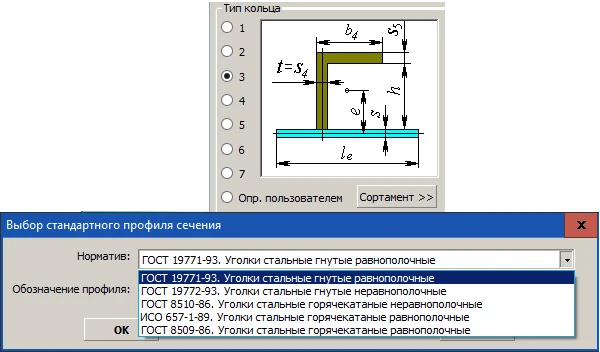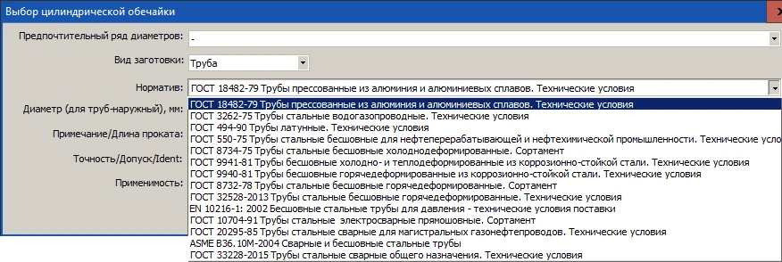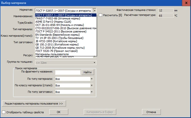 Выбор используемых материалов (по ГОСТ, ASME, EN) из базы данных с возможностью ее пополнения, при этом величины допускаемых напряжений, модулей упругости и т.д. подставляются и изменяются программой при изменении материала, температуры или толщины стенки