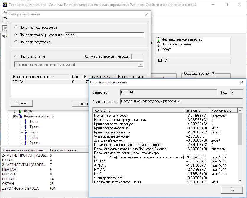 - Выдается справка по опорным константам индивидуальных веществ из информационной базы (молекулярному весу, критическим температуре и давлению и др.).