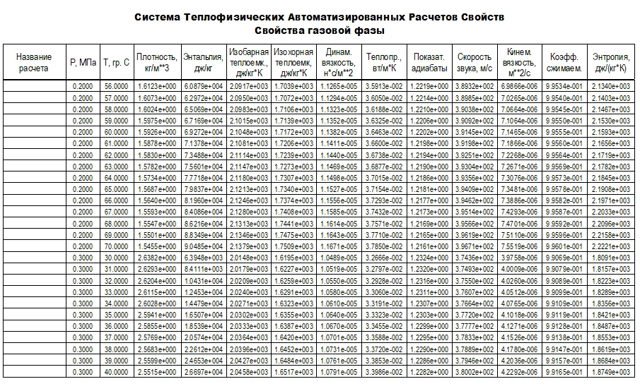 Номенклатура рассчитываемых свойств жидкой и газообразной фаз включает