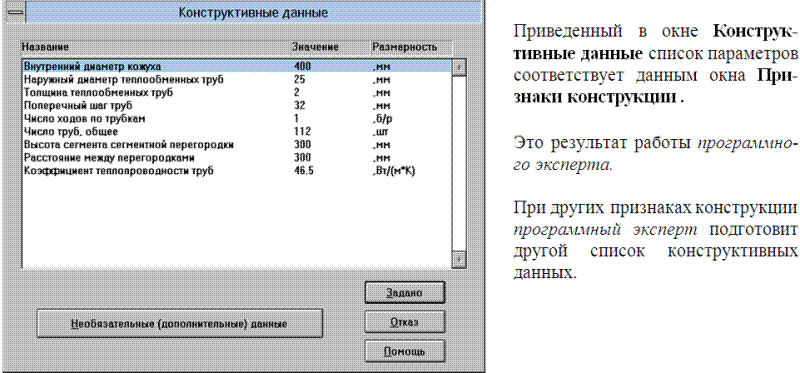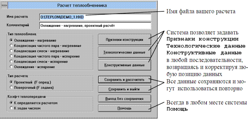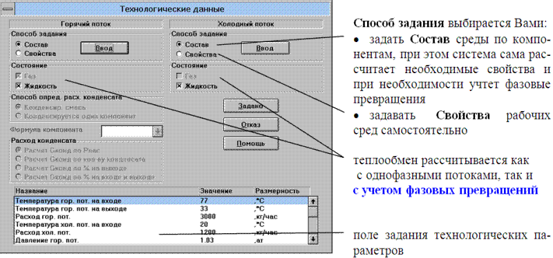 Все многообразие задач и вариантов расчета теплообменника сведено к простым операциям в четырех диалоговых окнах: Расчет теплообменника, Признаки конструкции, Технологические данные и Конструктивные данные.